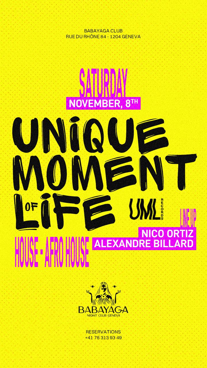 Plongez dans une expérience hors du temps avec “Unique Moment of Life”, la soirée qui enflammera le Babayaga Genève le 8 novembre. Préparez-vous à vivre une nuit d’énergie, de vibrations et d’élégance sonore grâce à un DJ set exclusif d’Alexandre Billard et Nico Ortiz.